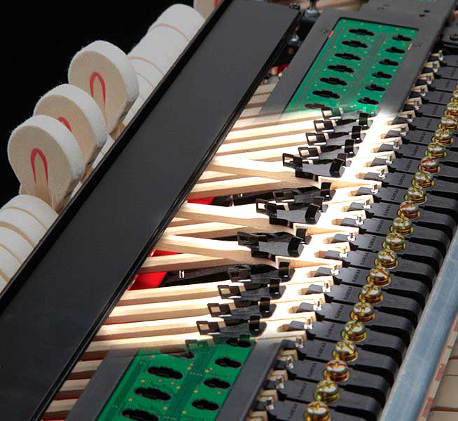 Weitere Kawai-Highlights sind Rahmenkonstruktionen mit besonders langen Baßsaiten für sattes Klangvolumen (Bild 3), ebenso wie das hervorragende ATX4-Silentsystem mit erstklassiger elektronischer Ausstattung, das berührungslos direkt die Hammerbewegung abtastet und nicht die Tastenbewegung (Bilder 4-6).