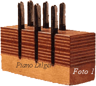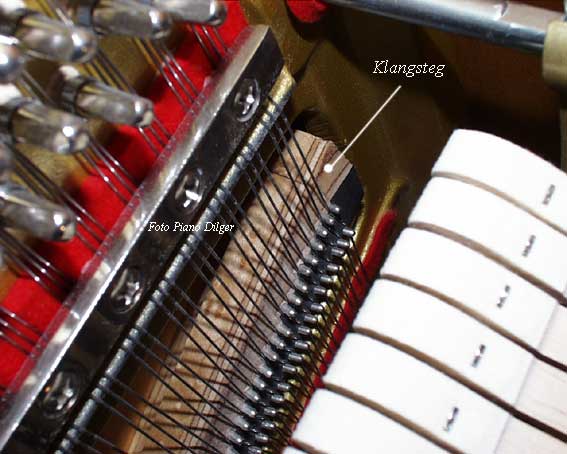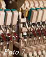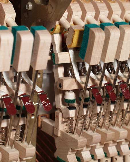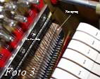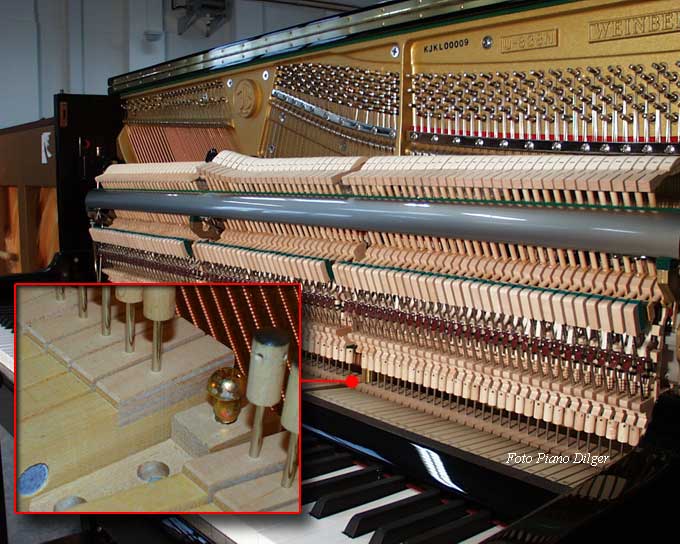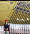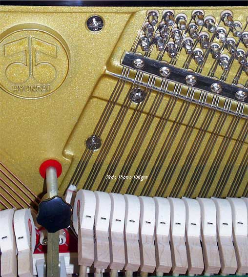 Eine massive Rastenkonstruktion an der Klavierrückseite (Foto 6) ist für Weinberg-Instrumente genauso selbstverständlich wie eine Mechanik aus Weißbuchenholz (Foto 7). Hier hat sich europäischer Einfluß durchgesetzt, genauso wie bei der Konstruktion der akustischen Anlage, die Klaus Fenner im Auftrag der koreanischen Hersteller grundlegend überarbeitet hat. Das Ergebnis kann sich sehen und hören lassen: Lange Baßsaiten (Foto 8) und daraus resultierend ein kräftiger grundtöniger Baßklang und gleichzeitig saubere und klare Töne im Diskant. Dazu trägt ebenfalls bei der verwendete Stahlsaitendraht der Feindrahtwerke Röslau (Link) aus Bayern (Foto 9).