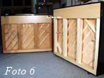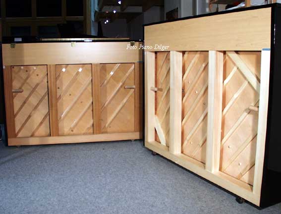Wie bei deutschen Herstellern findet überwiegend Holz Verwendung, das nach langer Lagerung im Freien in einem computer-kontrollierten Trocknungsprozess bis auf eine gleichmäßige Restfeuchte von nur noch 6% getrocknet wurde. Aus diesem Grund sind diese Instrumente geradezu ideal auf Fußbodenheizungen einsetzbar. Da nicht nur der Stimmstock aus vielschichtverleimtem Buchen- bzw. Felsenahorn- Sperrholz gefertigt wird, sondern auch der Resonanzboden aus mehreren Schichten weißer Sitka-Spruce (einer Fichtenart, die in bestimmten Höhenlagen wächst und so sehr dichte Jahresringe bildet) kreuzverleimt wird, können infolge trockener Heizungsluft keine Risse auftreten. Ebenfalls die Klangstege (Foto 3) tragen eine mehrschichtige Aufdopplung, um die Rißgefahr speziell im oberen Bereich zu eliminieren. Die darunter befindliche Schicht, in die die Stegstifte noch hineinreichen, ist massiv Buche und sorgt so für möglichst verlustfreie Übertragung der Saitenschwingungen auf den Resonanzboden. Die Tasten tragen im hinteren Bereich mehrschichtige Aufleimungen (Foto 4), um auch hier der Rißbildung um die Pilotenstifte vorzubeugen. Zu guter letzt besteht der gesamte Spieltisch (Foto 5) aus einer satten 4 cm starken Sperrholzschicht!