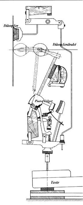 in ein Klavier mit der sogenannten “Oberdämpfungsmechanik”, deren Name daher rührt, dass die Dämpfer oberhalb der Hammerköpfe angeordnet sind im Gegensatz zur heute üblichen Ausführung der Klaviermechaniken