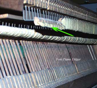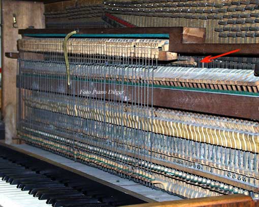 der im Diskant die Dämpfer fast auf den Klangsteg drücken (roter Pfeil), der Ton unerwünscht lange nachhallt. Da an dieser Stelle wenig konstruktiver Raum zur Dämpferanordnug
