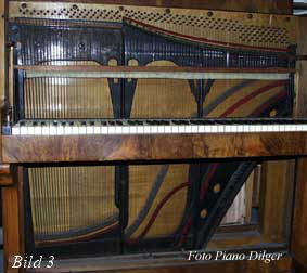 Ein großer Schritt hin zu klangvolleren Klavieren war die Idee, die Baßsaiten durch diagonale Anordnung über den Diskantsaiten -bei gleicher Bauhöhe eines Instrumentes- länger ausführen zu können (Bild 4). Nach diesem Prinzip besaitet man auch heute noch Klaviere, jedoch werden die Instrumente heute konsequent durchkonstruiert mit Rahmen, die bis auf das Bodenbrett reichen und Baßsaiten, die den Diskant in noch flacherem Winkel kreuzen (vergleiche Bild 5 mit Bild 7).