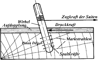 quer zur Maserung, da die ebenfalls auftretenden hohen Druckkräfte (aufgrund der Zugkraft der Saiten) vom Holz in seiner Längsrichtung besser aufgenommen werden können. Dies gilt